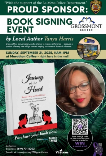 September 5, 2025 (La Mesa) -- Local author, domestic violence survivor and advocate Tanya Harris will host a powerful community book signing and awareness event on Sunday, September 21, 2025, from 11:00 a.m. to 1 p.m. at the gazebo at Grossmont Center mall (5500 Grossmont Center Dr., La Mesa).